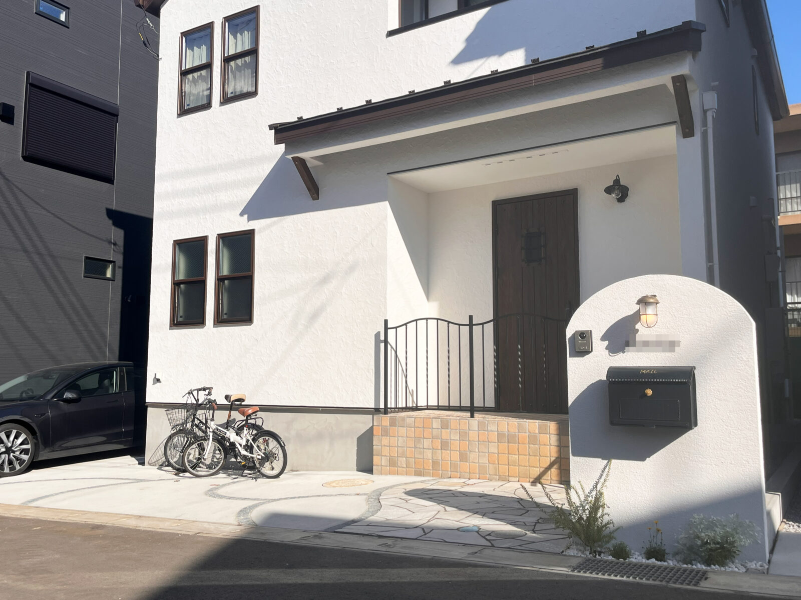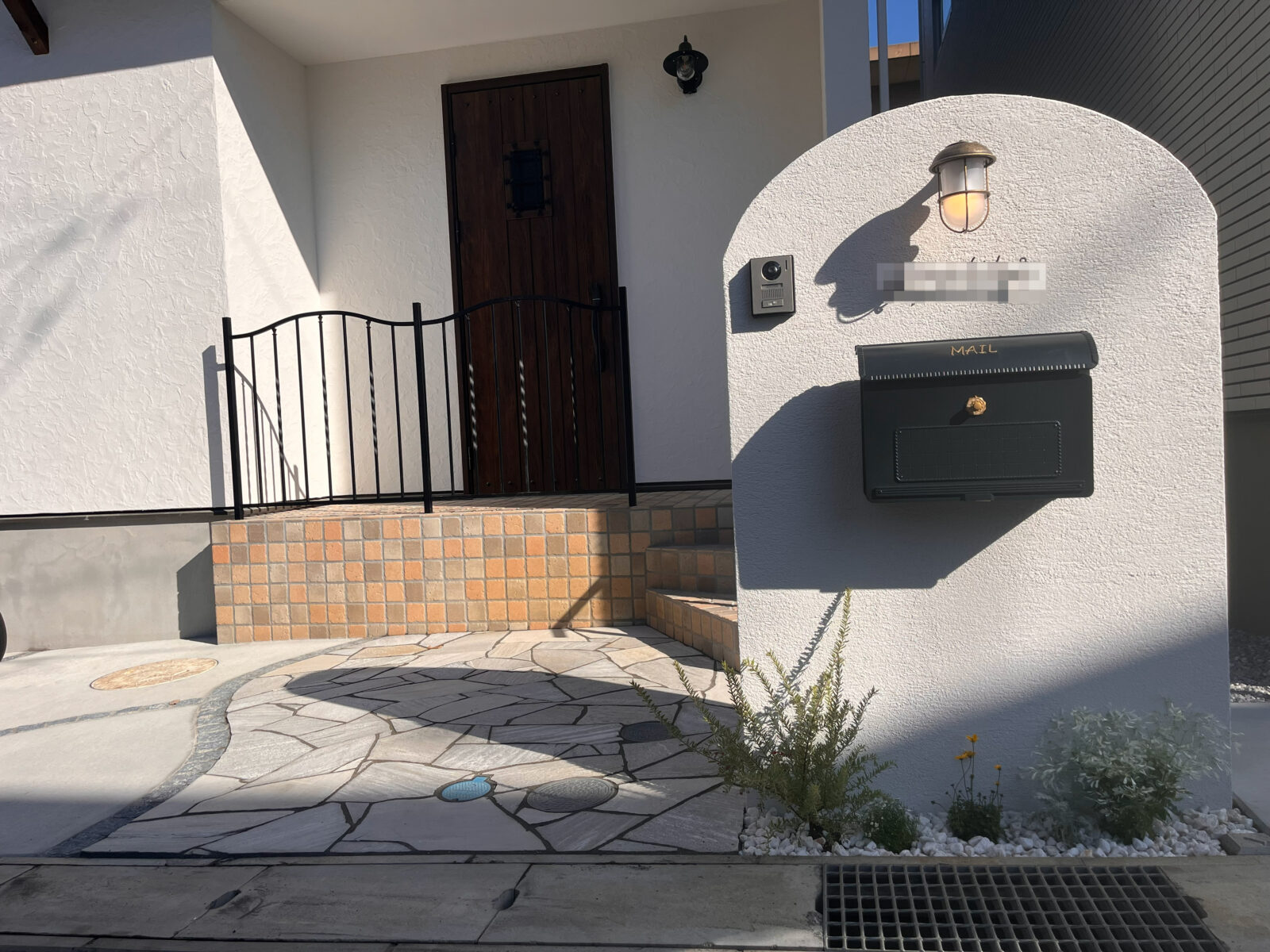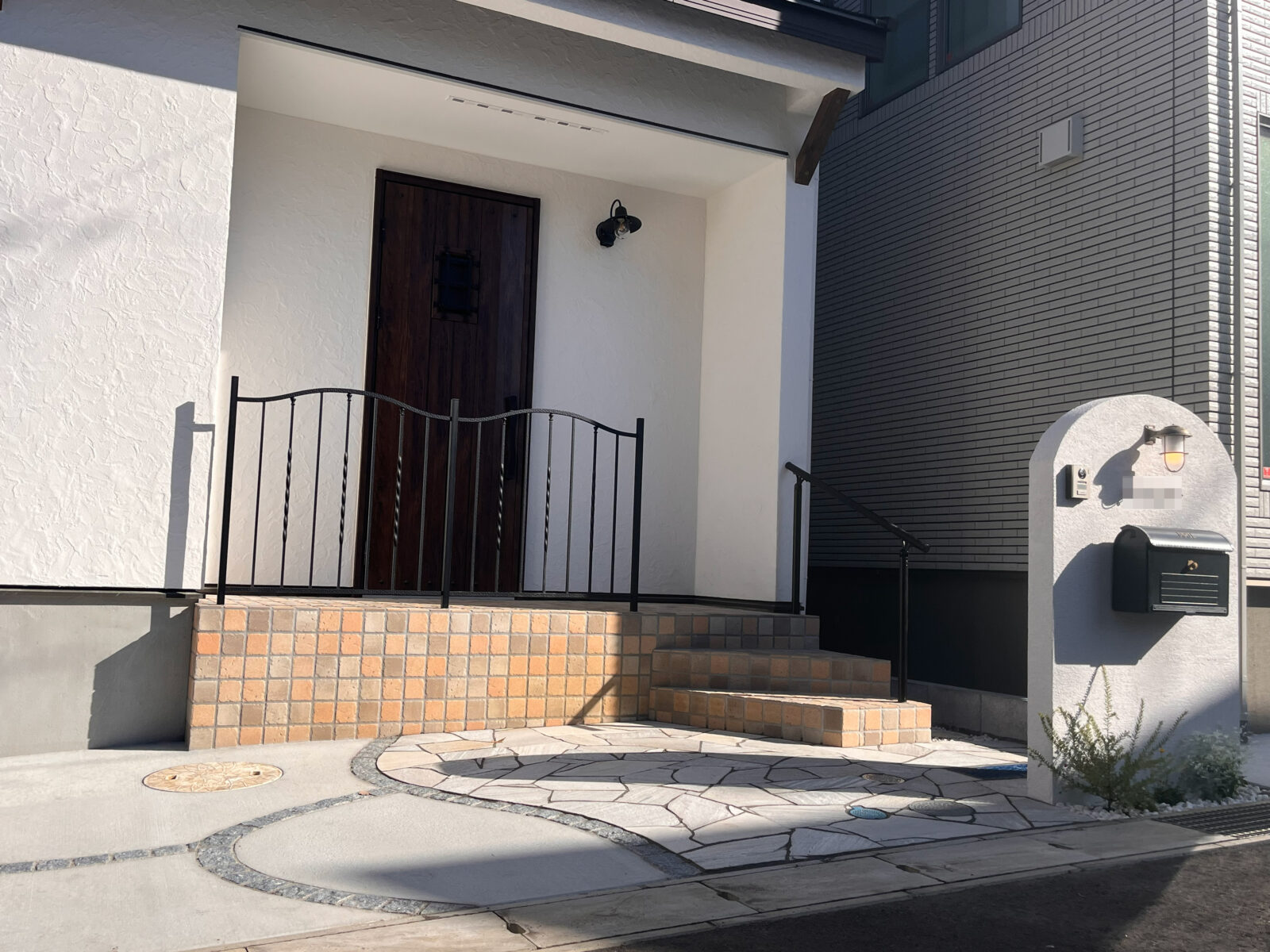 横浜市でナチュラルモダン外構を施工|曲線アプローチと塗り壁門柱が映える戸建てエクステリア